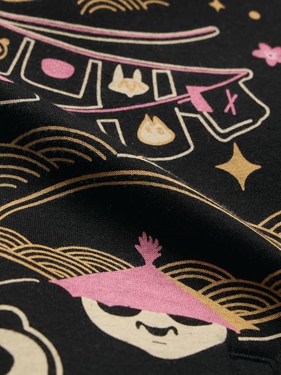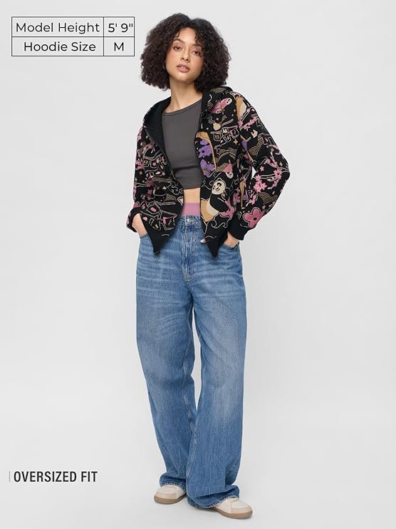 he Souled Store Kung Fu Panda: Warrior Women and Girls Long Sleeves Hooded Neck Zipper Front Black All Over Printed Cotton Blend Oversized Hoodies